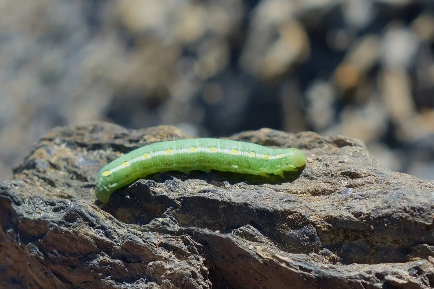 Young caterpillar green, then grey-brown with pale longitudinal bands, finally large white spots.
