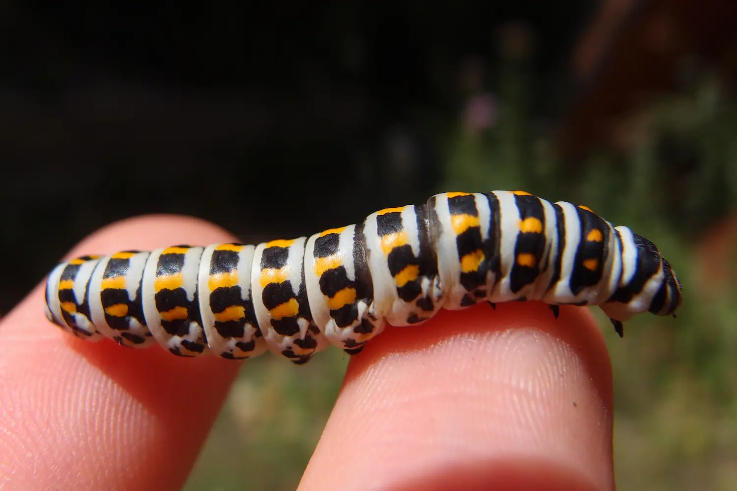 Chenille blanche. Segments noirs avec taches oranges. Comme toutes les chenilles de Papilionidae, elle possède un osmeterium, organe orange qu'elle déploie en cas de danger.