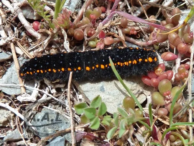 Chenille noir velouté, avec points latéraux jaunes-rouges. Espèce protégée en France, arrêté du 24 septembre 1993.