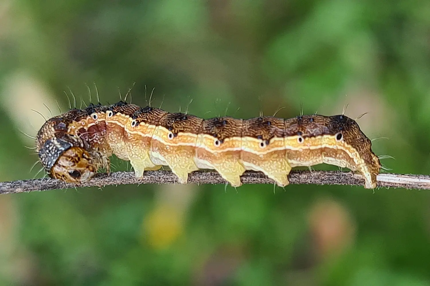 Chenille velue, verte à brune. Bandes claires, longitudinales, disposées sur chacun de ses côtés.