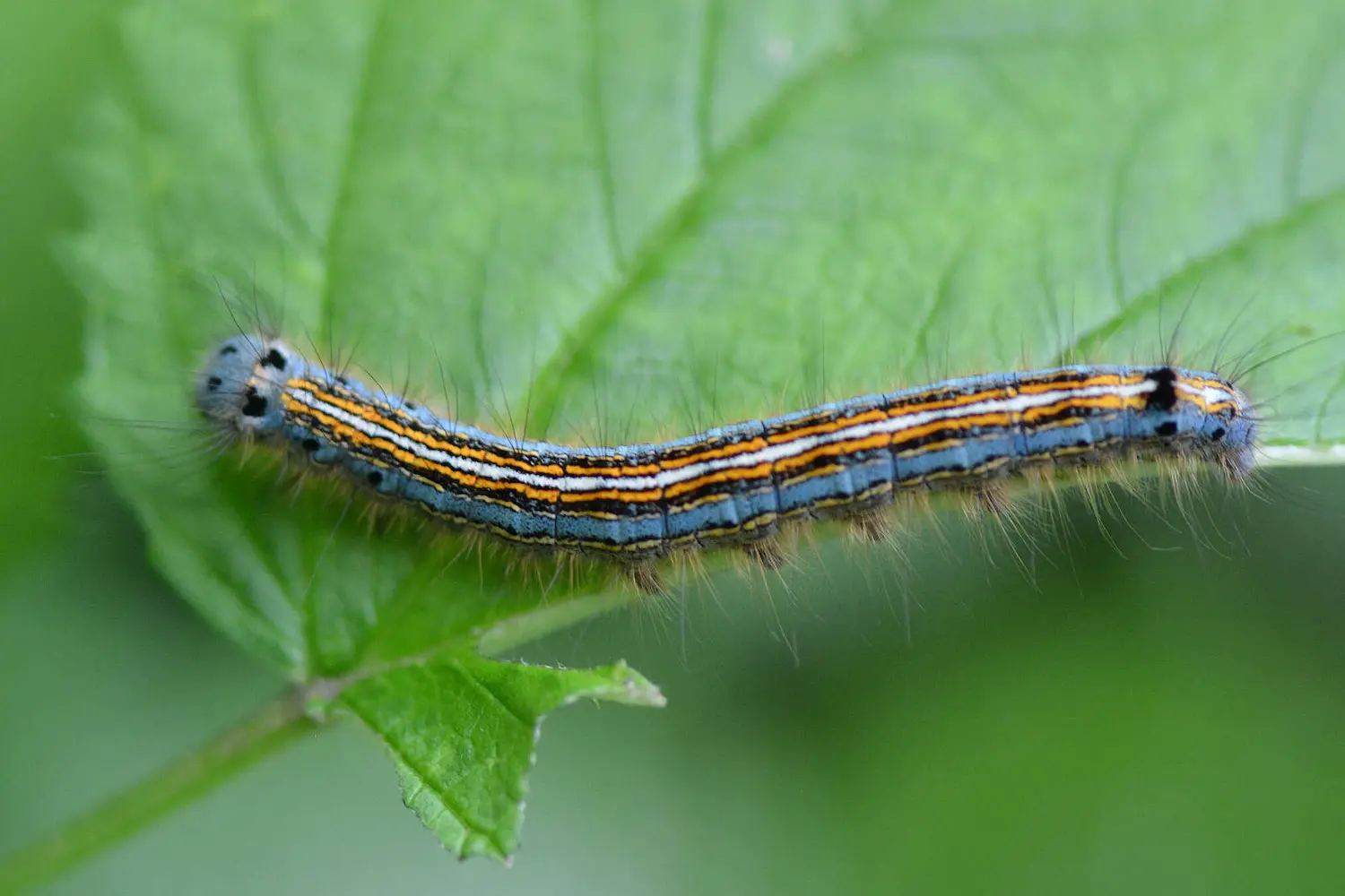 Corps gris bleuté. Ligne dorsale blanche bordé de lignes rouge orangé. Chenille avec une pilosité rousse. Tête gris bleuté avec deux tâches noires.
