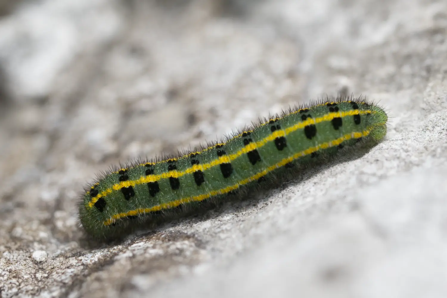 Chenille verte avec une ligne latérale blanche et une ligne dorsale sombre. Fine pilosité.