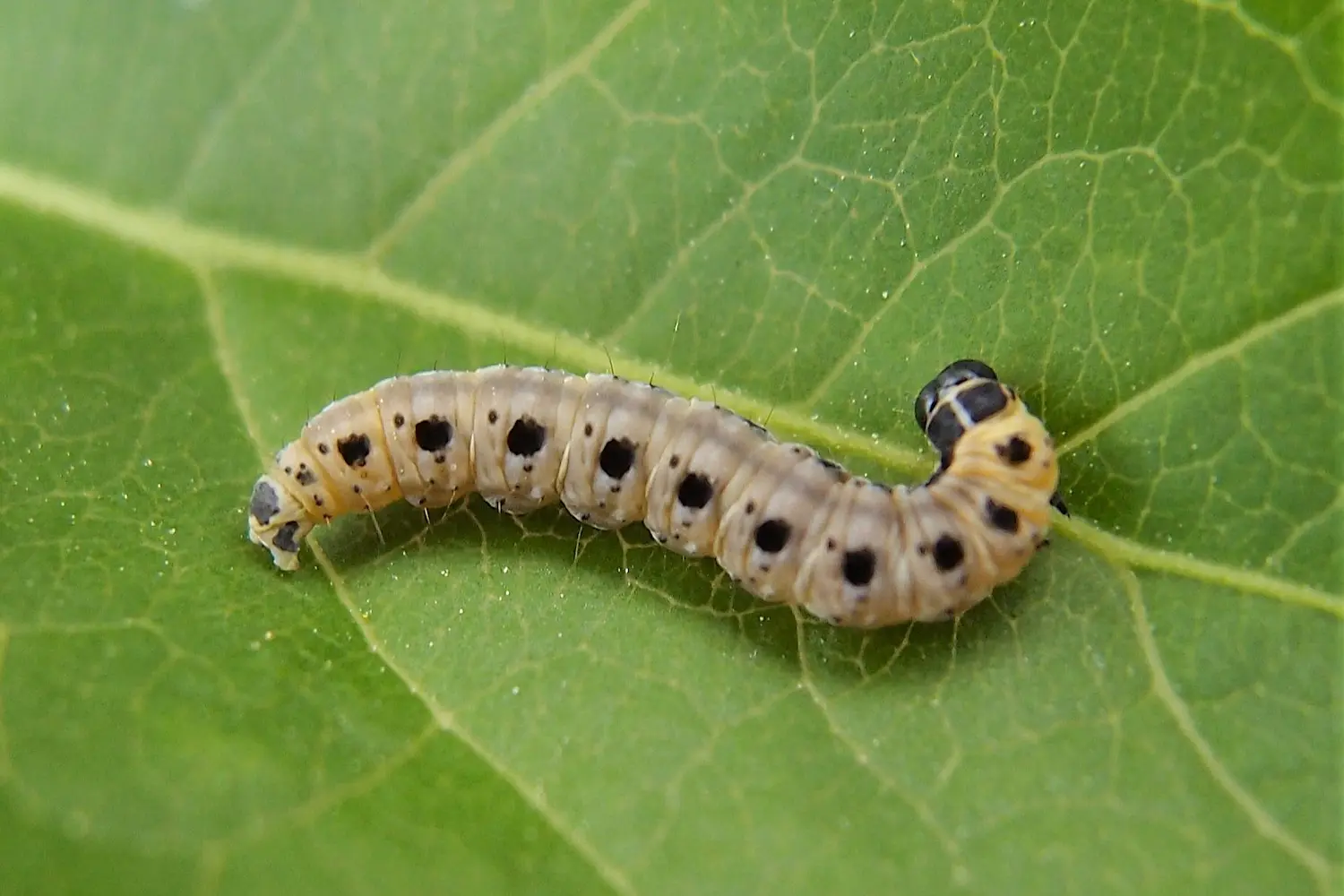 Chenille jaunâtre à blanchâtre avec deux rangées de points noirs sur le dos. Tête noire. Vit en colonies sous des toiles de soie.