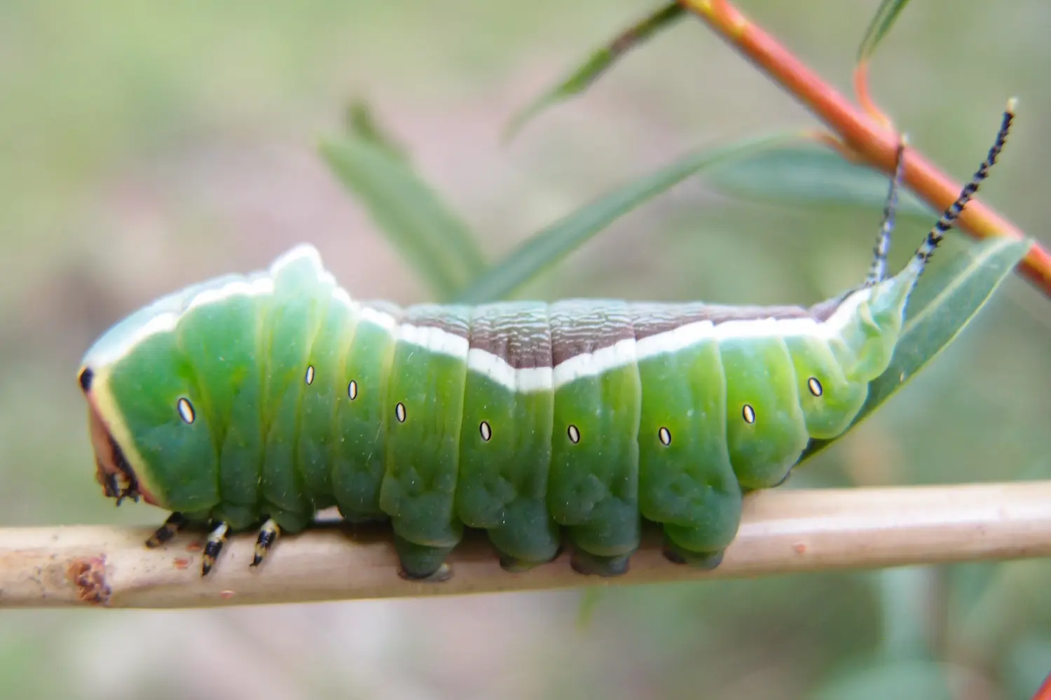 Chenille très particulière en raison de ses 2 'queues' d'où peuvent sortir 2 'filaments' roses ! Note : la chenille est capable de cracher un liquide corrosif (acide formique) si elle est dérangée !
