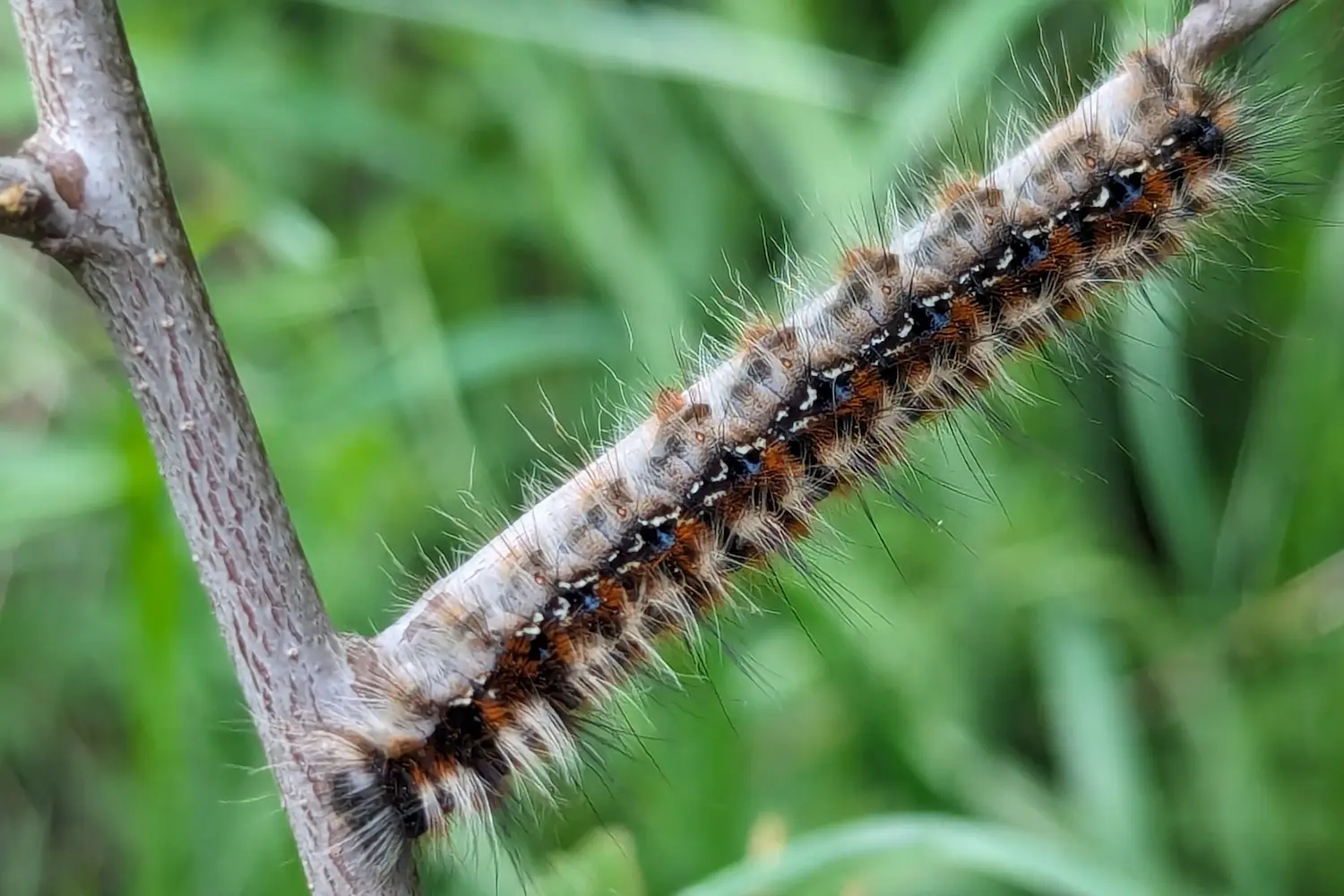 Chenille brun foncé avec des touffes de poils laineux gris-blanc sur les flancs. Ligne dorsale rousse. Tête brune.