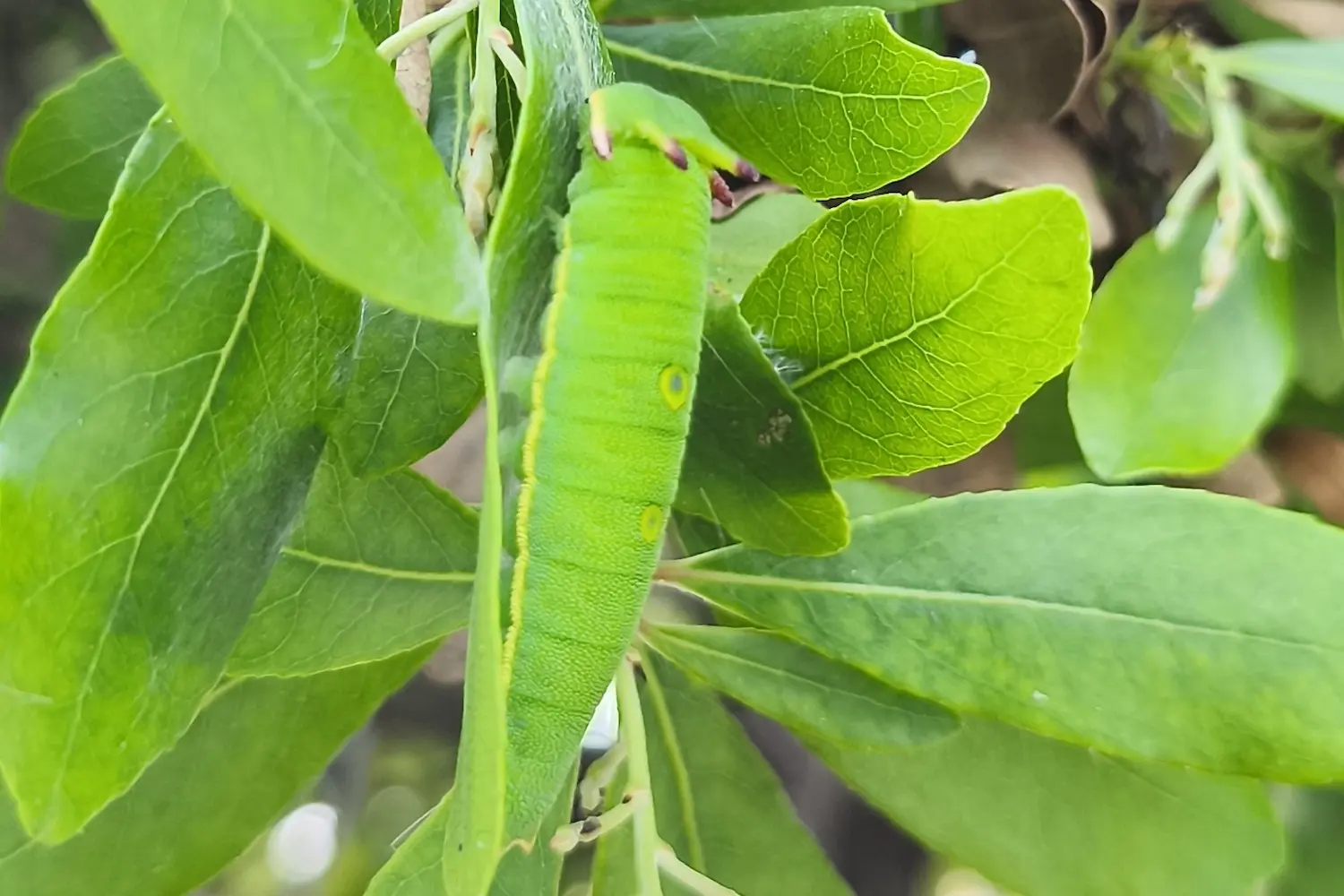 Chenille verte tachetée de blanc. Possède quatre excroissances à pointe rougeâtre derrière la tête.