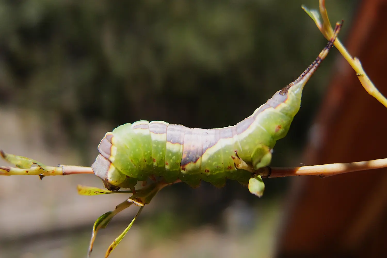 Chenille très caractéristique des Notodontidae, de couleur verte avec un large losange dorsal brun-pourpre à reflets violacés sur l'abdomen. La tête est brun-rouge brillant. Elle possède deux appendices caudaux allongés et mobiles (furcula) en remplacement des fausses pattes anales, qu'elle agite lorsqu'elle est menacée, pouvant également projeter de l'acide formique. Sa posture au repos est caractéristique : elle relève simultanément la tête et l'abdomen, ne se tenant que sur ses pattes médianes.