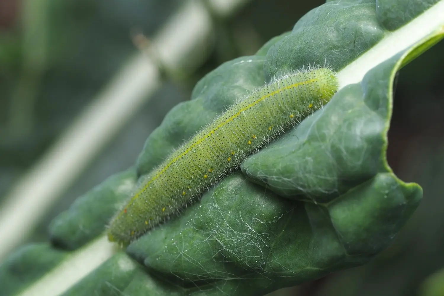 Chenille verte avec une ligne dorsale jaune et des points jaunes sur les flancs. Fine pilosité.