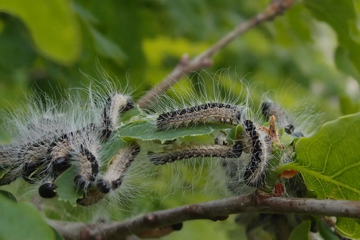 Chenille de gris à gris brun. Poils longs soyeux et blancs. Chenille urticante. Attention si vous êtes allergique !
