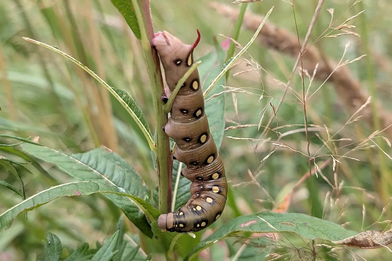 Chenille de grande taille, polymorphe, présentant deux formes principales. La forme claire est vert olive à vert jaunâtre, ornée d'une série de taches oculées latérales blanc-jaune cerclées de noir, disposées sur chaque segment. La forme sombre, plus fréquente, est noire à brun très foncé, avec les mêmes taches oculées latérales jaune vif à orange cerclées de noir, très contrastées sur le fond sombre. Dans les deux formes, une ligne dorsale peut être visible. La corne caudale est longue, droite, noire avec la base rouge-orangée ou entièrement orangée selon les individus. La tête est ronde, de couleur assortie au corps.