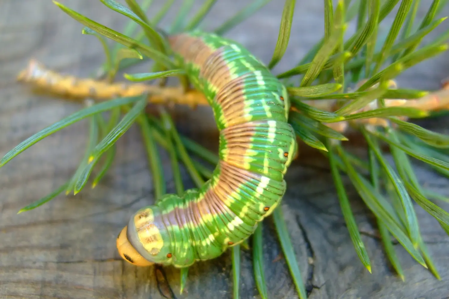 Chenille d'abord verte avec des lignes longitudinales claires, puis avec une bande dorsale brune. Se camoufle aisément sur des rameaux de pins