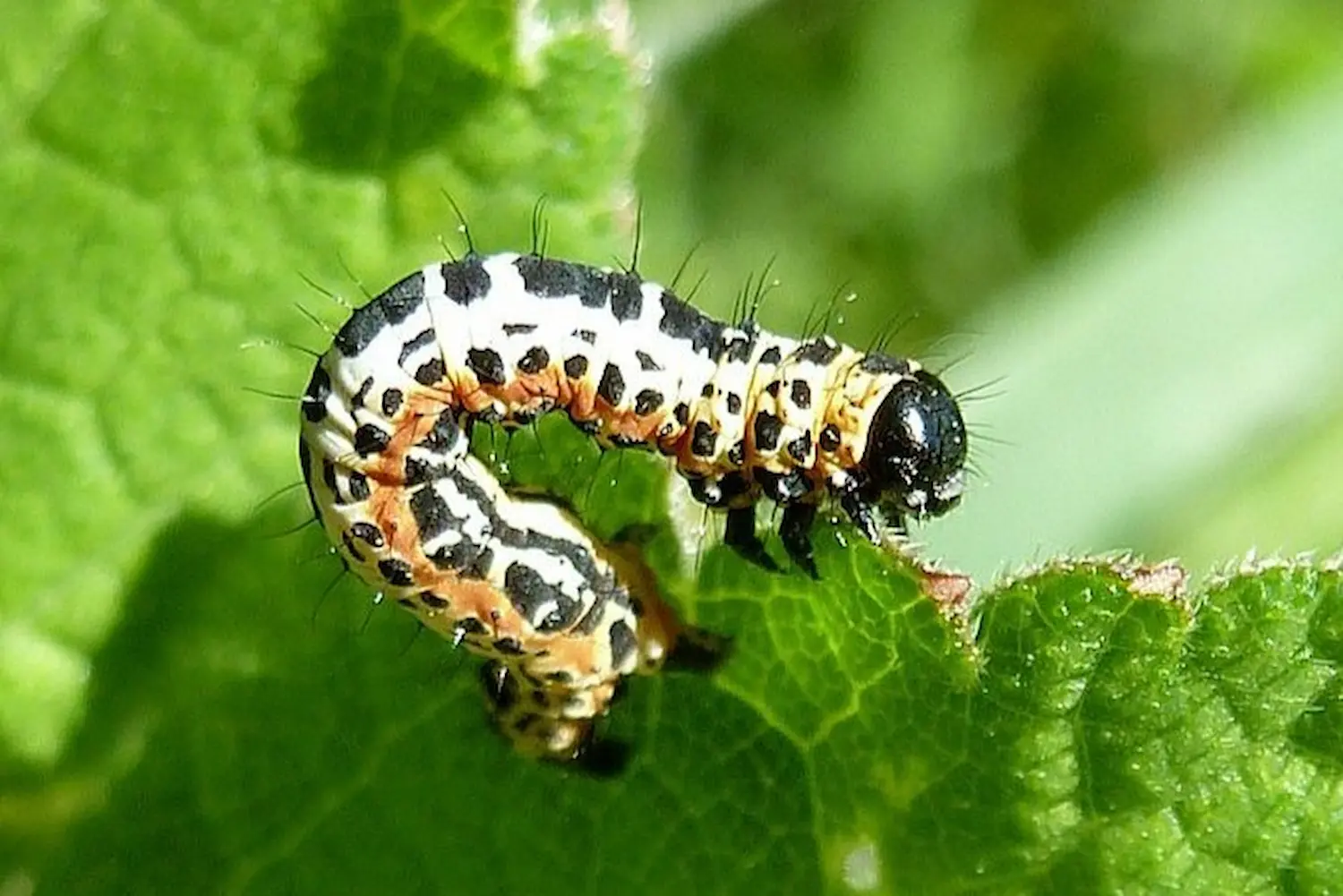 Chenille blanche avec des taches noires et une ligne latérale orange-jaune. Arpenteuse aux mouvements caractéristiques.