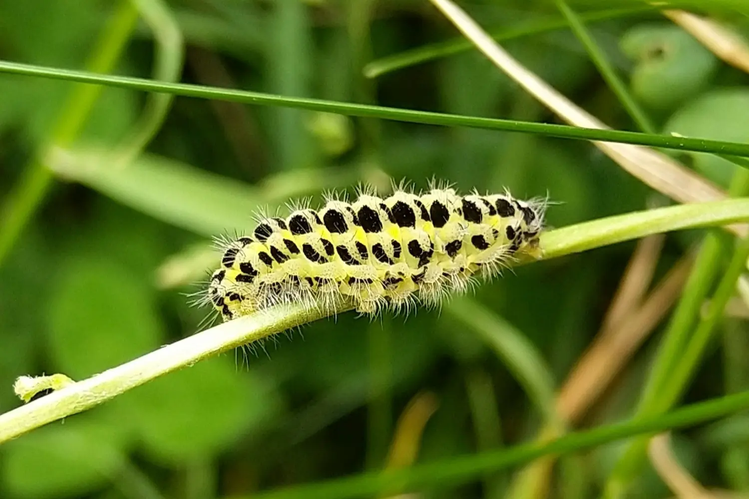 Chenille trapue, jaune-vert avec deux rangées de taches noires sur le dos et les flancs. Légèrement velue.